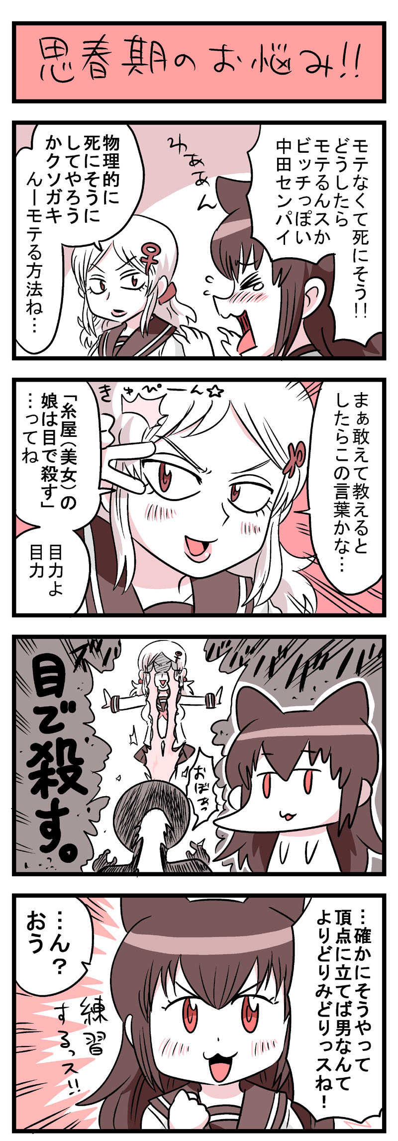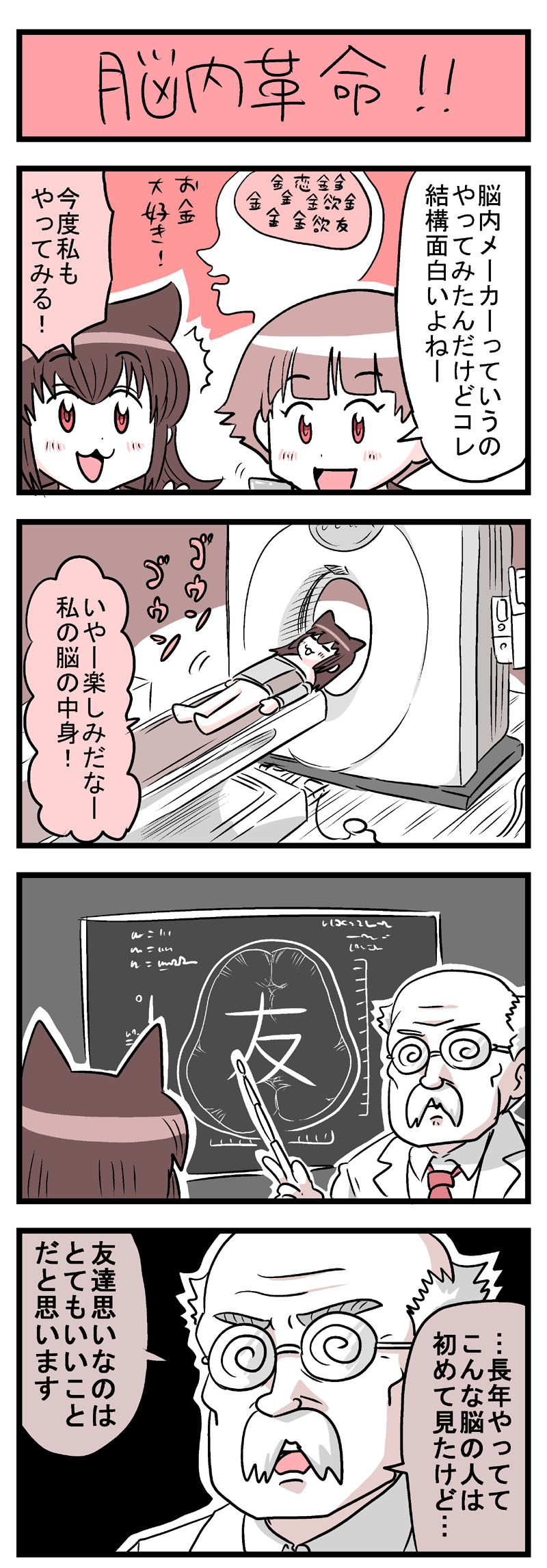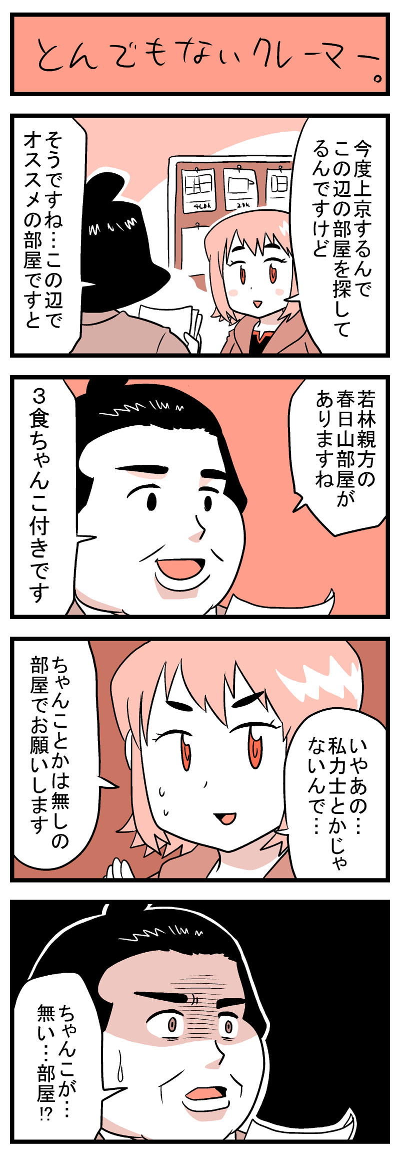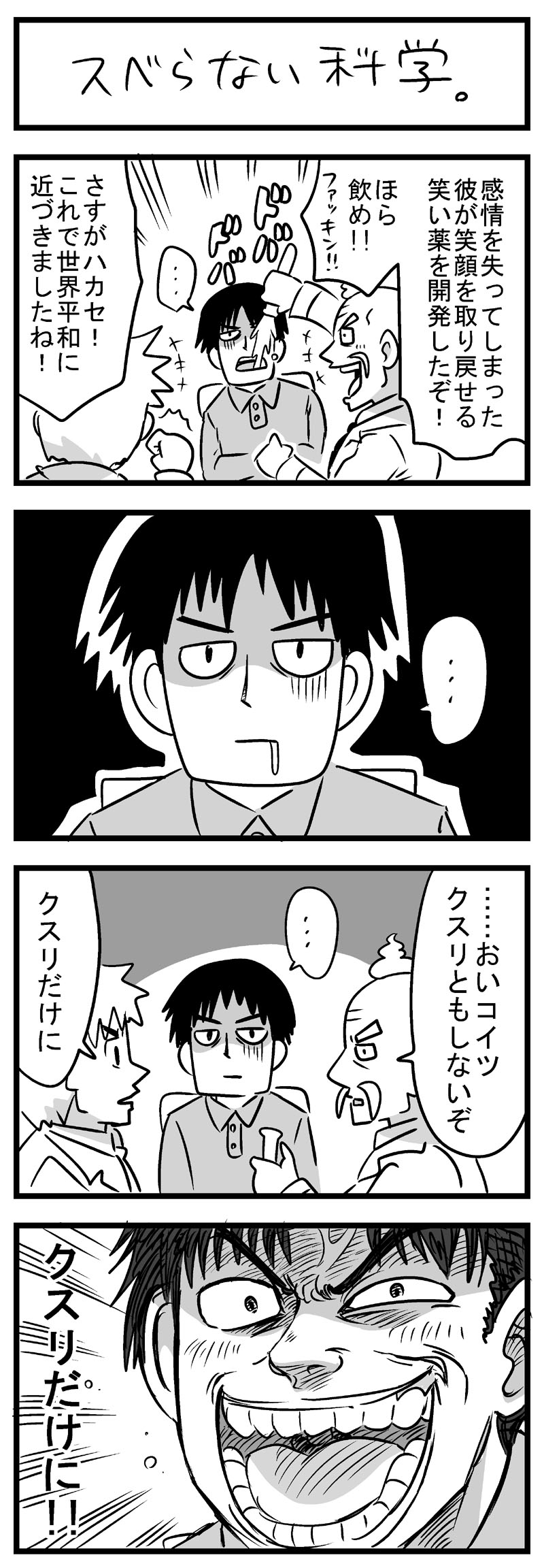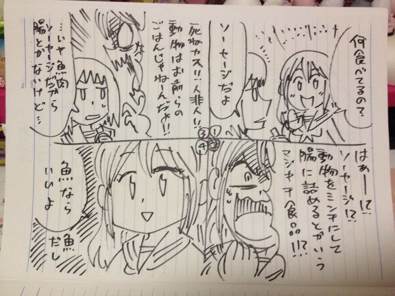 私は最近2色カラーを始めました。 フルカラーではないのにそれっぽく見えるから素敵。 あとは1時間4コマと1時間萌え4コマ。 お題「力士」です。 紙相撲ネタをやろうと思いましたが、 部屋違いに落ち着きました。 この女アタマおかしいぞ。 お題「ω」です。 この口は好きですが何て名称なんでしょうか。 ちなみに僕の中のルールで下ネタは 「うんこ」と「チンコ」までです。 お題「寿司」です。 女優の剛力さんとはまったく関係ありません。 関係ないんです。 関係ないけどドラマ「私の嫌いな探偵」の今後に期待してます。 1時間萌え4コマ「試験」です。 4コマ目の詰め込みすぎ感が素晴らしいです。 思ったより反応もらえたんですが、多分 ワシが描いててケツがかゆくなるような4コマが 世間一般ではウケるんだなとわかりました! 1時間4コマ「甘える」です。 ネタ出しに20分かかりましたがギリで2色カラーは達成しました。 4コマ目を見たあと1,2コマ目を見ると、なんでこの子は 絶対効果が薄いその戦法をとったのか疑問ですね。 とにかく数描いて修行です。 色々描くことで色んな引き出しが開くはず!