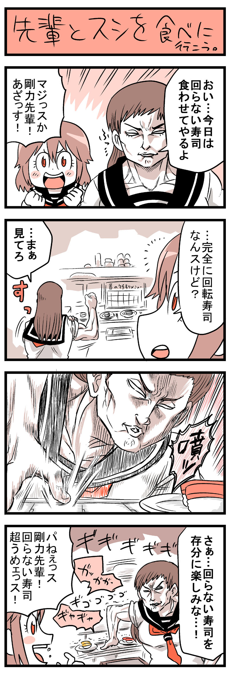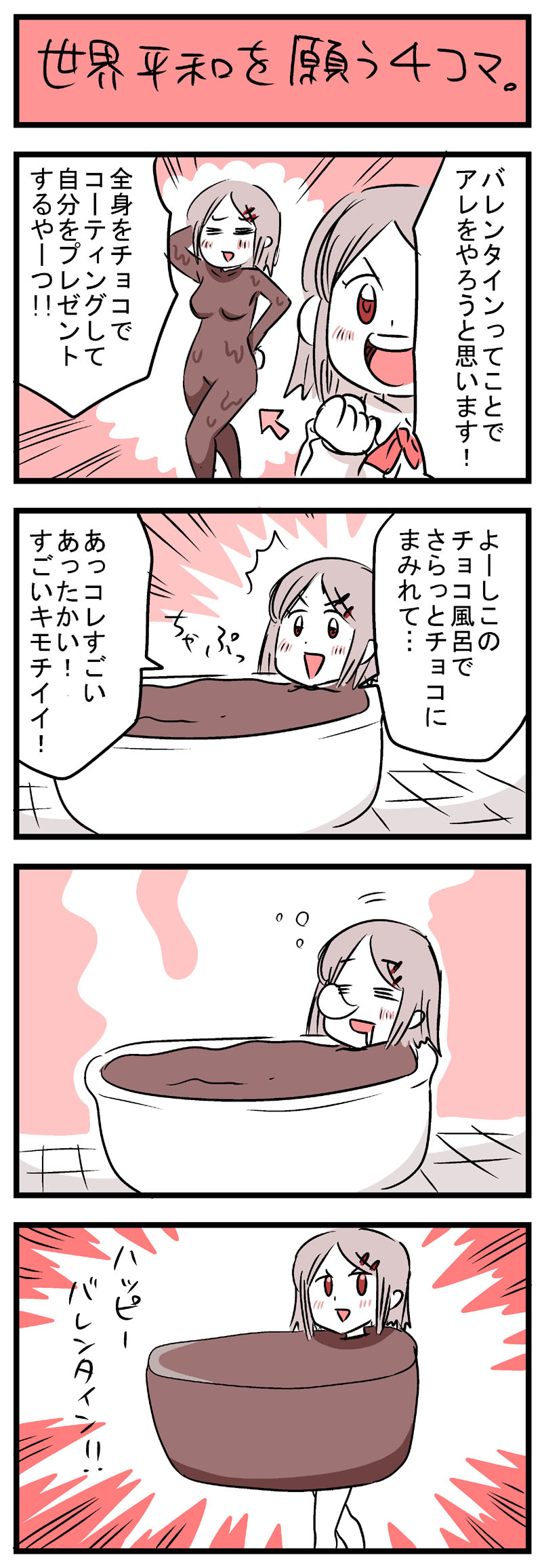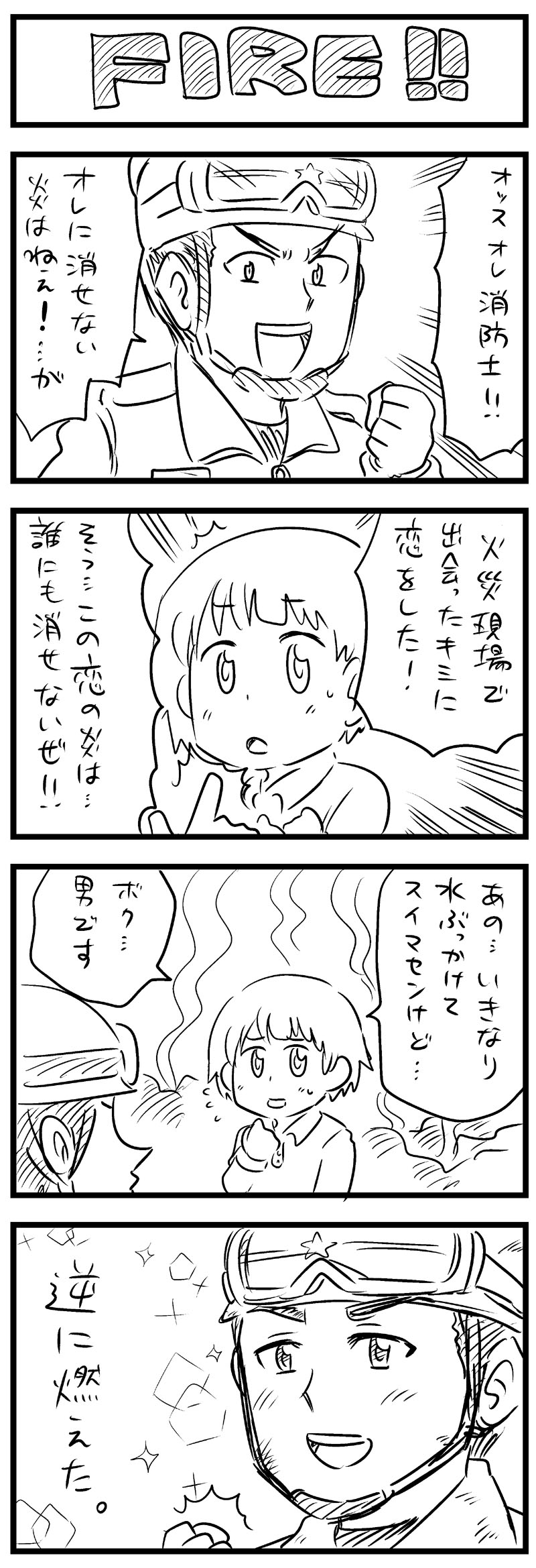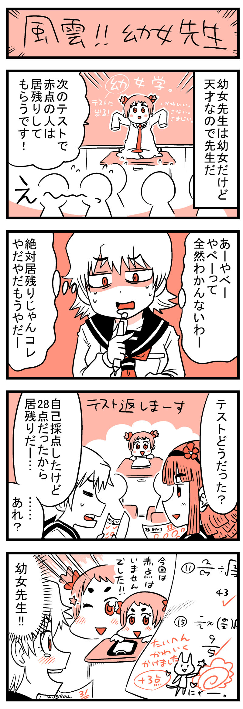 私は最近2色カラーを始めました。 フルカラーではないのにそれっぽく見えるから素敵。 あとは1時間4コマと1時間萌え4コマ。 お題「力士」です。 紙相撲ネタをやろうと思いましたが、 部屋違いに落ち着きました。 この女アタマおかしいぞ。 お題「ω」です。 この口は好きですが何て名称なんでしょうか。 ちなみに僕の中のルールで下ネタは 「うんこ」と「チンコ」までです。 お題「寿司」です。 女優の剛力さんとはまったく関係ありません。 関係ないんです。 関係ないけどドラマ「私の嫌いな探偵」の今後に期待してます。 1時間萌え4コマ「試験」です。 4コマ目の詰め込みすぎ感が素晴らしいです。 思ったより反応もらえたんですが、多分 ワシが描いててケツがかゆくなるような4コマが 世間一般ではウケるんだなとわかりました! 1時間4コマ「甘える」です。 ネタ出しに20分かかりましたがギリで2色カラーは達成しました。 4コマ目を見たあと1,2コマ目を見ると、なんでこの子は 絶対効果が薄いその戦法をとったのか疑問ですね。 とにかく数描いて修行です。 色々描くことで色んな引き出しが開くはず!