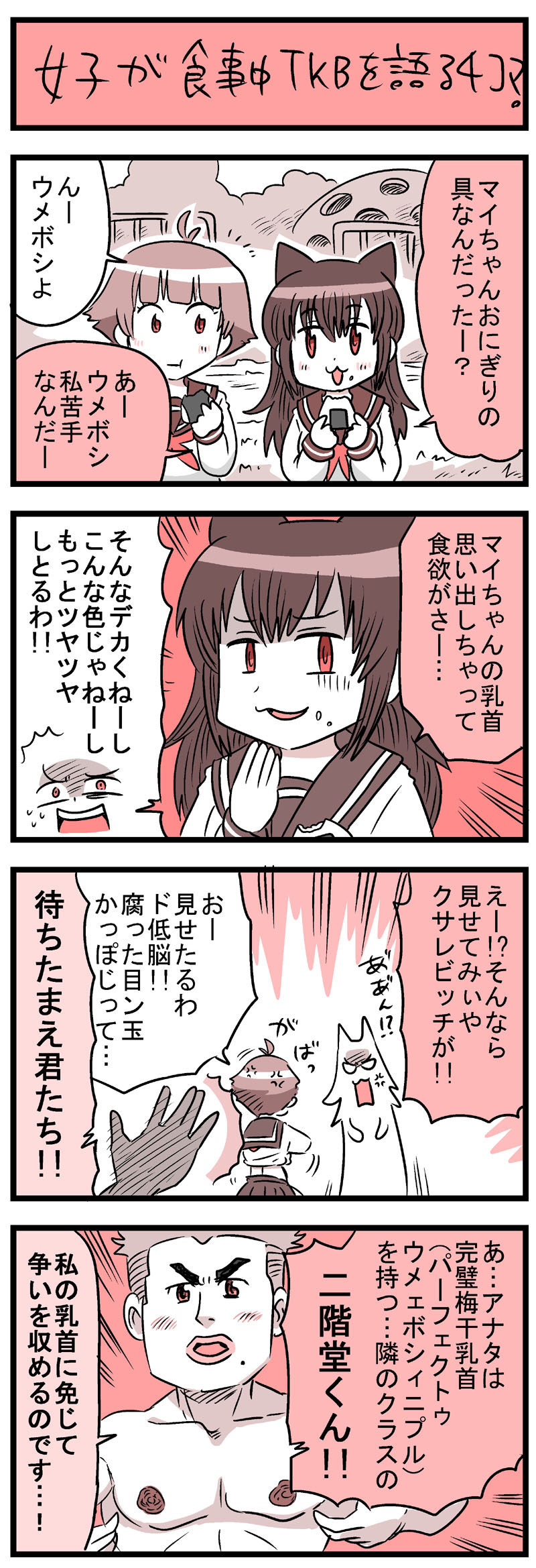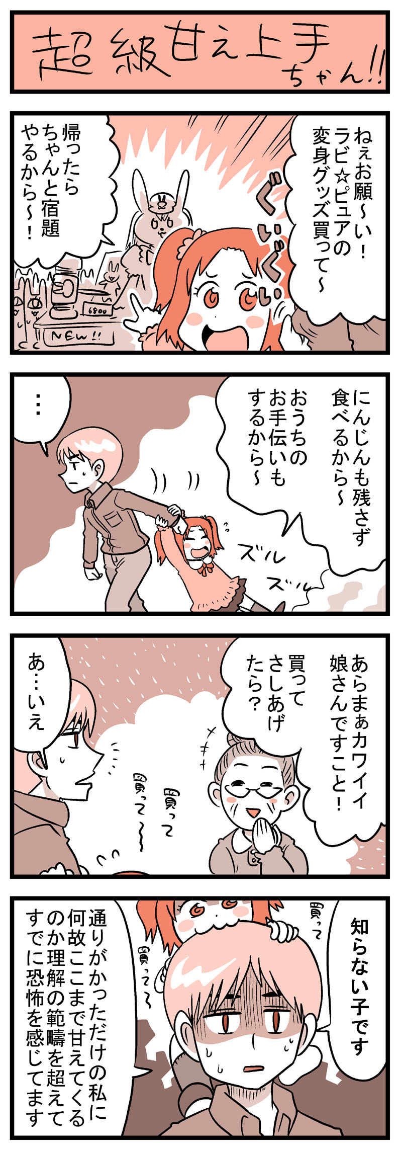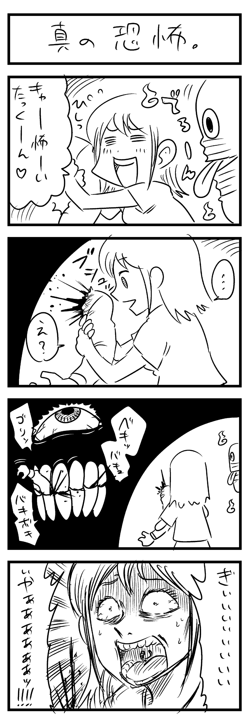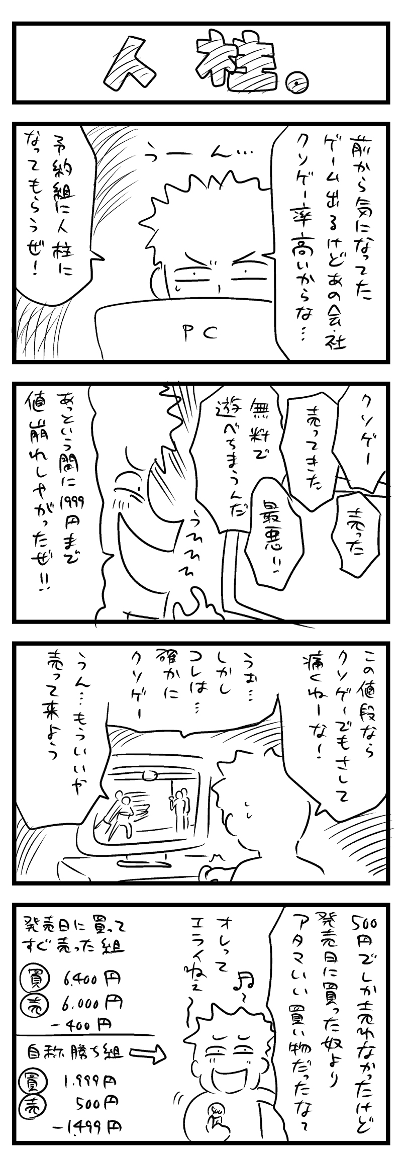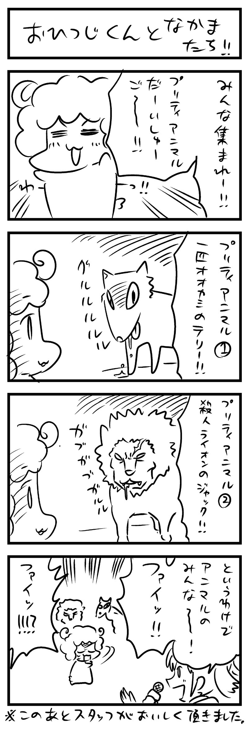 私は最近2色カラーを始めました。 フルカラーではないのにそれっぽく見えるから素敵。 あとは1時間4コマと1時間萌え4コマ。 お題「力士」です。 紙相撲ネタをやろうと思いましたが、 部屋違いに落ち着きました。 この女アタマおかしいぞ。 お題「ω」です。 この口は好きですが何て名称なんでしょうか。 ちなみに僕の中のルールで下ネタは 「うんこ」と「チンコ」までです。 お題「寿司」です。 女優の剛力さんとはまったく関係ありません。 関係ないんです。 関係ないけどドラマ「私の嫌いな探偵」の今後に期待してます。 1時間萌え4コマ「試験」です。 4コマ目の詰め込みすぎ感が素晴らしいです。 思ったより反応もらえたんですが、多分 ワシが描いててケツがかゆくなるような4コマが 世間一般ではウケるんだなとわかりました! 1時間4コマ「甘える」です。 ネタ出しに20分かかりましたがギリで2色カラーは達成しました。 4コマ目を見たあと1,2コマ目を見ると、なんでこの子は 絶対効果が薄いその戦法をとったのか疑問ですね。 とにかく数描いて修行です。 色々描くことで色んな引き出しが開くはず!