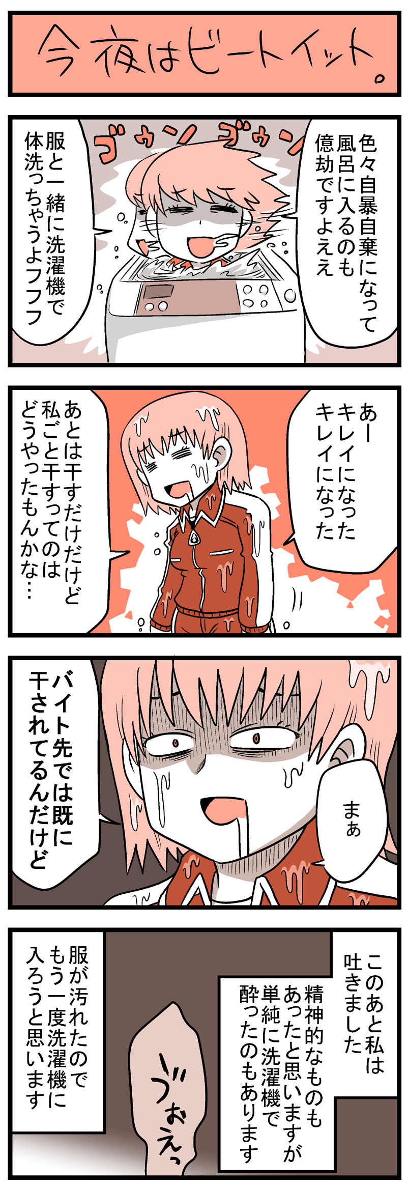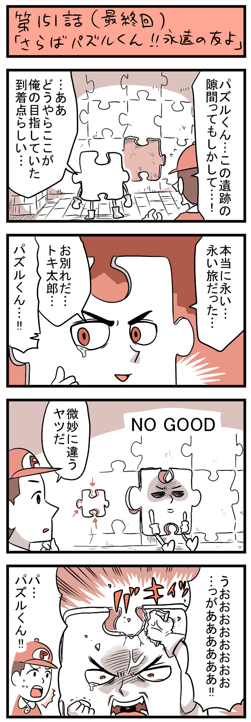 お題「洗濯機」です。 実にネガティブです。 無限ループって怖くね? お題「パズル」です。 ここまで長く続いたパズルくんとトキ太郎の冒険を 最後まで描けて本当によかったです。 誰か1話から150話まで描いてください。 あと「のんじゃん!」79話目です。 進行を優先して一切ボケないという暴挙に出るところでしたが、 無理やり茶々を入れたので助かったと見せかけてさらに進行が 遅れています。 【過去分はニコニコ静画でまとめあります】 http://seiga.nicovideo.jp/comic/7760?track=list 去年の8月から、合算して150本くらいは4コマ描きましたが、 数をこなしたことで、最近はネタの幅が広がった気がします。 雑誌に載せてもらえるようなもんは描けてないけれど、 自分が面白いと思うものを探ってきたこれまでは きっと無駄にならないはず。 きっとたぶんおそらく。