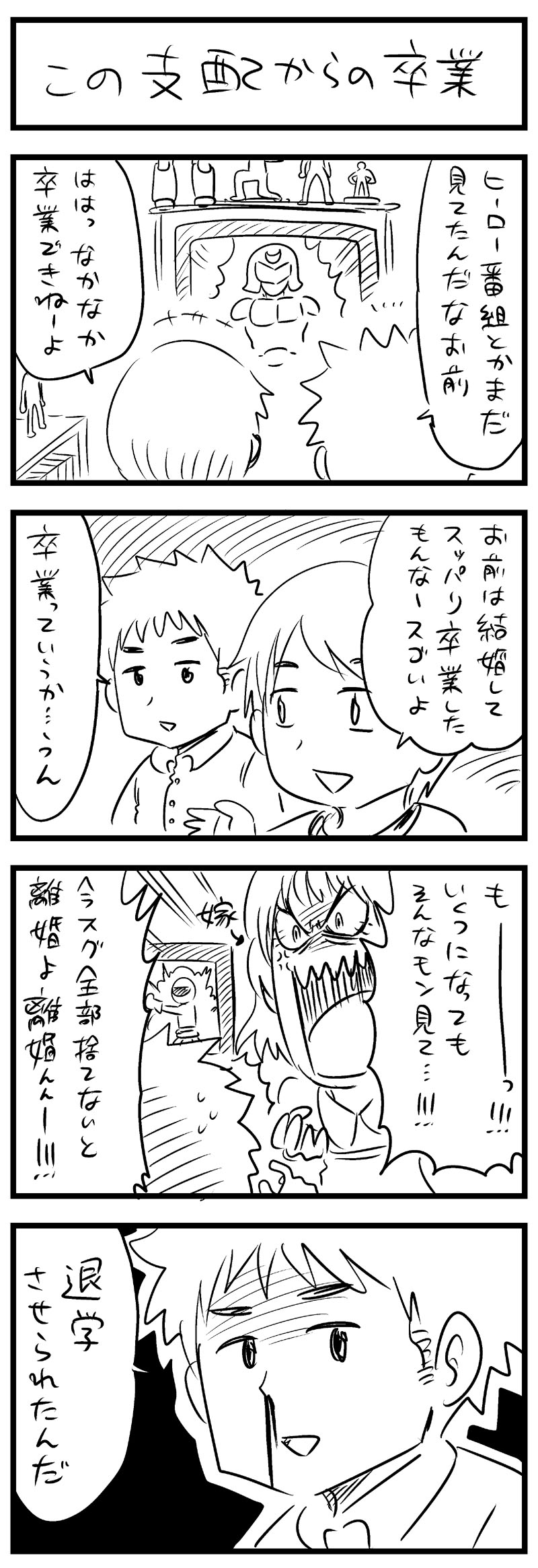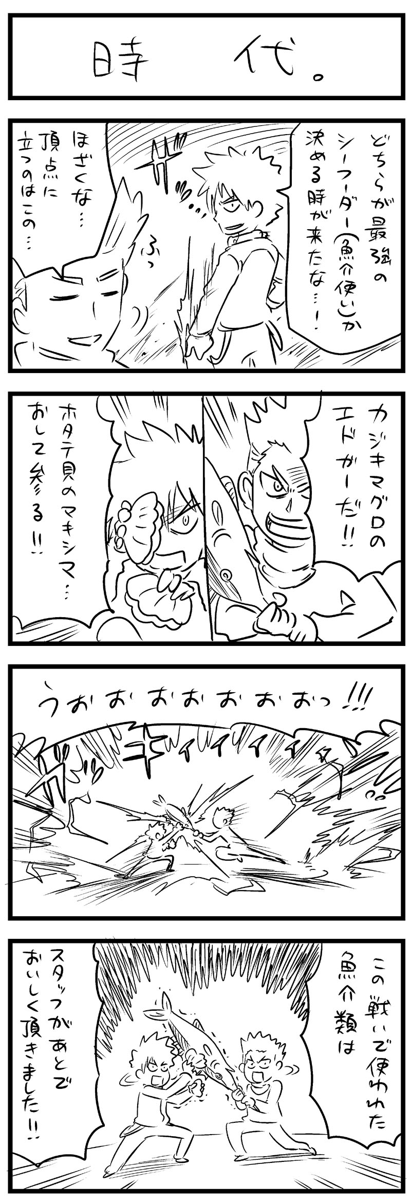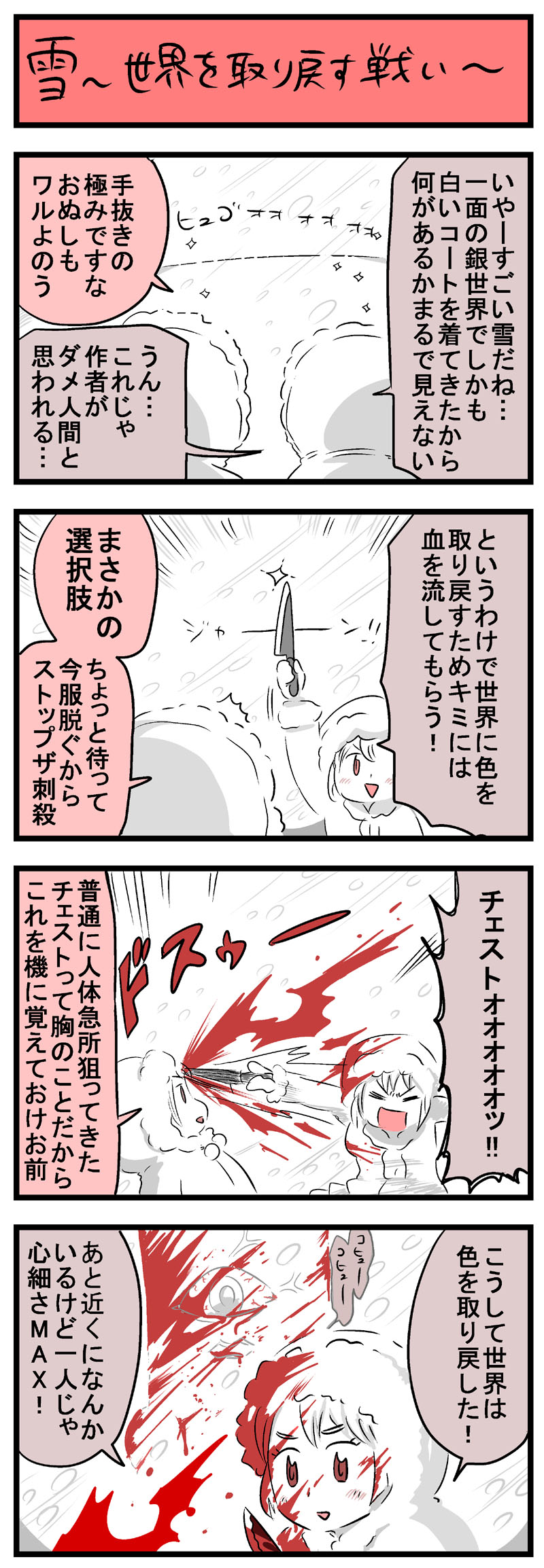 まずは1時間4コマシリーズから。 お題「雪」 血の吹き出かたが上手く描けました。(棒) お題「ソーセージ」 コミティア参加のため外出先で描きました。 お題「薬」 女の子が出ないだけでここまでモチベが下がるとは。 お題「梅干し」 全国の二階堂さんすいません。 1時間萌え4コマ「部活」 青春とかわかりません。 お題「目」 数年前に描いたネタの再利用だよ!! 1時間萌え4コマ「スリ」 スリって…。 お題「脳」 2コマ目の機材を描くのに力尽きました。 続いてツイッターでお題を募集したやーつ他。 お題「アルシンド」 お題が悪い。(断言) お題「バレンタイン」 バレンタインその後。 お題「バレンタイン」 マザーグースを使いたかっただけ。 10分4コマ「カニ」 10分で4コマを描くというイカれた企画のアレ。 10分4コマ「ノミネート」 最後のコマのセリフを直したりで、結局15分かかった。 10分4コマ「アニマル」 伝家の宝刀おひつじくん投入。 お題「弁護士」 個人的にすごい好きだけど評判はよくない。 お題「消防士」 燃え上がれラブファイアー。 お題「魚介類」 というわけだったのさ。 お題「ハチミツ」 セリフの多さはともかく勢いは満足。 お題「卒業」 みなさん卒業おめでとうございます。 「真の恐怖」 からくりサーカス思い出して描きたくなったネタ。 お題「人柱」 募集してないのにオオトリさんがお題をくれました。 オオトリさん連続掲載マジでおめでとうございます。 ガンダム00の4コマ 「アレルヤが自然にハブられる4コマ」 意外とたくさん描いてるなぁ。 現在は4コマじゃない投稿用漫画に取り掛かってますが、 それが終わり次第次の投稿用4コマに行くぜ! PR