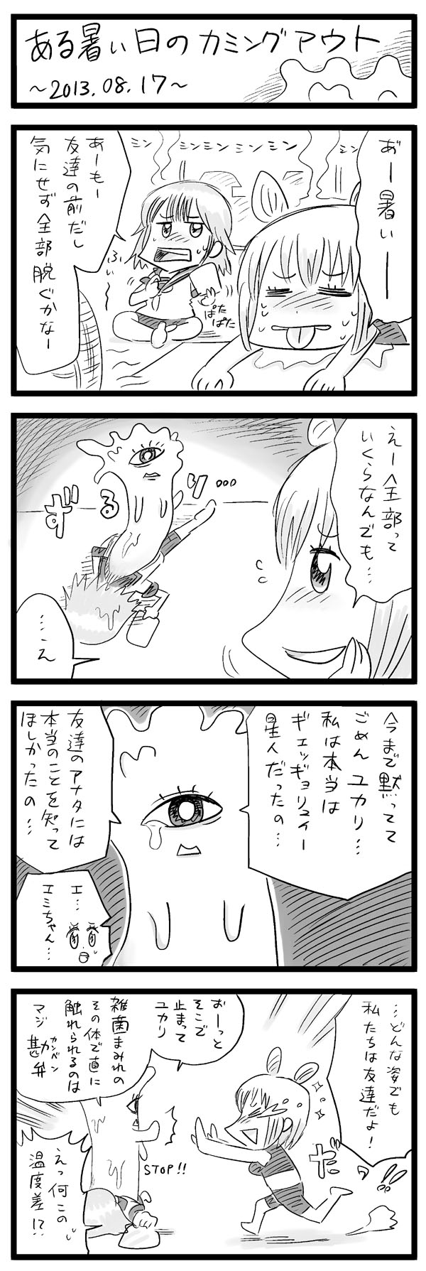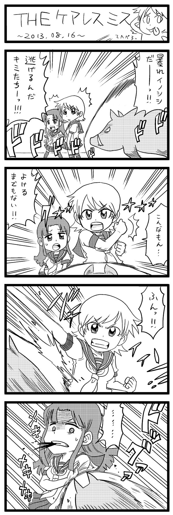 × [PR]上記の広告は3ヶ月以上新規記事投稿のないブログに表示されています。新しい記事を書く事で広告が消えます。 ここしばらくそれを取り戻すように色々描いてます。 来月になったらまた色々落ち着くんで、東京に持ち込みに行きます。 10月からはもっと良い環境になるといいなぁ。 今描いている投稿用漫画は、就職活動する女性が主人公。 当初はメインキャラを4人で行こうとネームを切ったんですけど、 どうやっても各キャラの描写が足りないということで一人削り。 3人に直してもまだ薄いということで、思い切ってさらに一人削り。 最終的にはメインキャラ二人という、当初のネームはなんだったんだレベルに。 毎回毎回反省点としてキャラの薄さが挙がるんですが、今回も改めて見直すまでそれが分からなかった。 むしろある程度手を加えた今も、キャラが薄いのが否めない。 この次に描く予定の4コマは、まずキャラありきという所を意識して描く予定です。 とりあえず今描いてるものも、キャラ要素を意識したネタを差込で盛り込みたい。 一般紙というか、雑誌の読者層を考えて、分析することも忘れず。 要素が薄いのはダメだけど、個性を出そうとしてあまりにぶっとんだものを盛り込むのはマイナスだから。 ダメな奴は失敗をするし、失敗にへこたれたりもまぬがれませんが、それを糧として前に進まないとダメな奴のままだと思うのです。 漫画にせよ仕事にせよ、今までのこと全てを教訓に、少しずつ進んで行きたいなぁ。 にほんブログ村 PR いやー進撃の巨人面白いですよねー。 ストーリーもバトルも、人間関係も面白い。 アニメ毎週楽しみにしてます。 巨人は強いけど、「弱点」と「立体機動装置」によって勝利の術がちゃんとある。 かといって楽勝というわけでもなく、不足の事態や巨人の予測できない動きであっさり殺されてしまうというバランスに、見てる方はドキドキさせられるわけです。 こういうバランスが本当に大好きです。 だから僕の考えた巨人も、なんかそんな感じで「強いけどがんばれば勝てる」的な要素をつけてみる。 これでパワーもスピードもズバ抜けてたりとかは個人的に違うと思うというか、むしろ弱くていいくらい。 ちょっと苦戦させられるけど1話の間にやられる程度のイメージ。 実験的ゲームエッセイ。 最近は逆転裁判5をクリアしました。 ドラクエ10にもハマってましたが、アレやってると時間がゴリゴリ削られるので今は離れてます。 こうしてる間にも、リーダーであるとんびさんが頑張ってチームレベル上げてくれてるはずです。 あとは3DSのDLソフト「ソリティ馬(ば)」を軽くやってます。 競馬ゲームと見せかけてひたすらソリティアをやり続ける異色のゲーム。 ポケモンを作ったゲームフリークの製作ですが、500円という値段以上に面白い。 むしろソリティア面白い。 のんじゃん!では珍しく下書きしてます。 クリスタでまだトーンあんまり使ったことなかったんで練習として。 こういうペイントソフトは、さぐりさぐりのほぼ勘だけで操作してるところがあるんで、便利な機能がいっぱい隠されてるんだろうなぁと思うと今の内にちゃんと調べとくべきかしら。 まぁ便利な機能があっても使いこなすような漫画描いてないんですけども。 日々練習してけばいつか使いこなせるさ。(適当) 落書き。 いっそこのくらいのデフォルメで4コマ描くかなぁ。 色々制限出てくるし、オッサンとかどう描いたらいいか分からんから行動に移せないけど。 今日はこのあと「スター・トレック イントゥ・ダークネス」の先行上映あるんで、栃木の黒磯まで車走らせてこようと思います。 そんで帰ってきたら今描いてる投稿用原稿を今週中に終わらせるべくやっちまおう。 |
