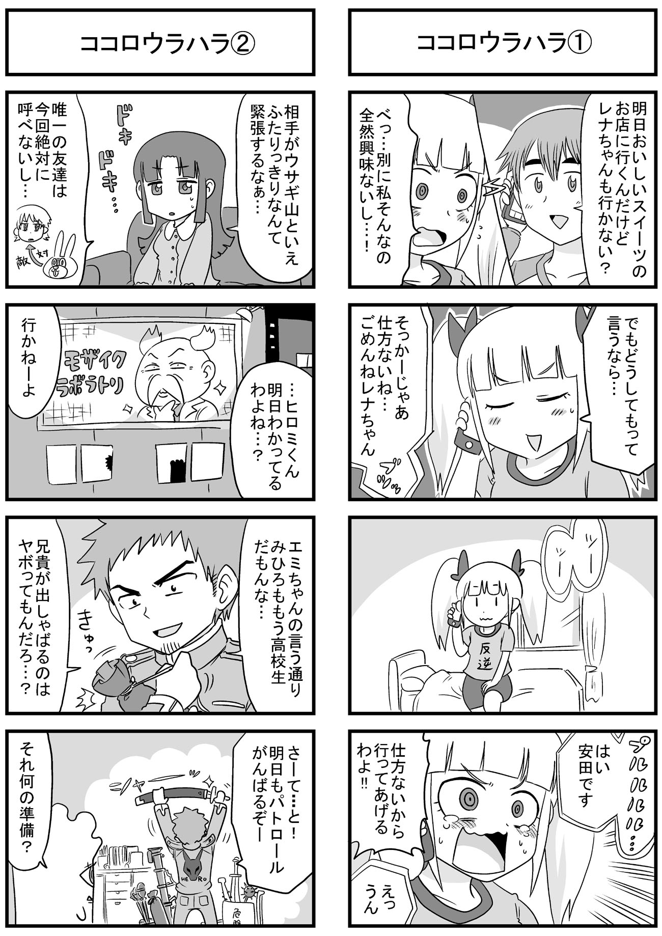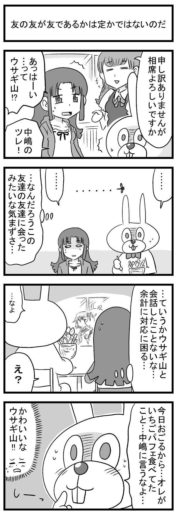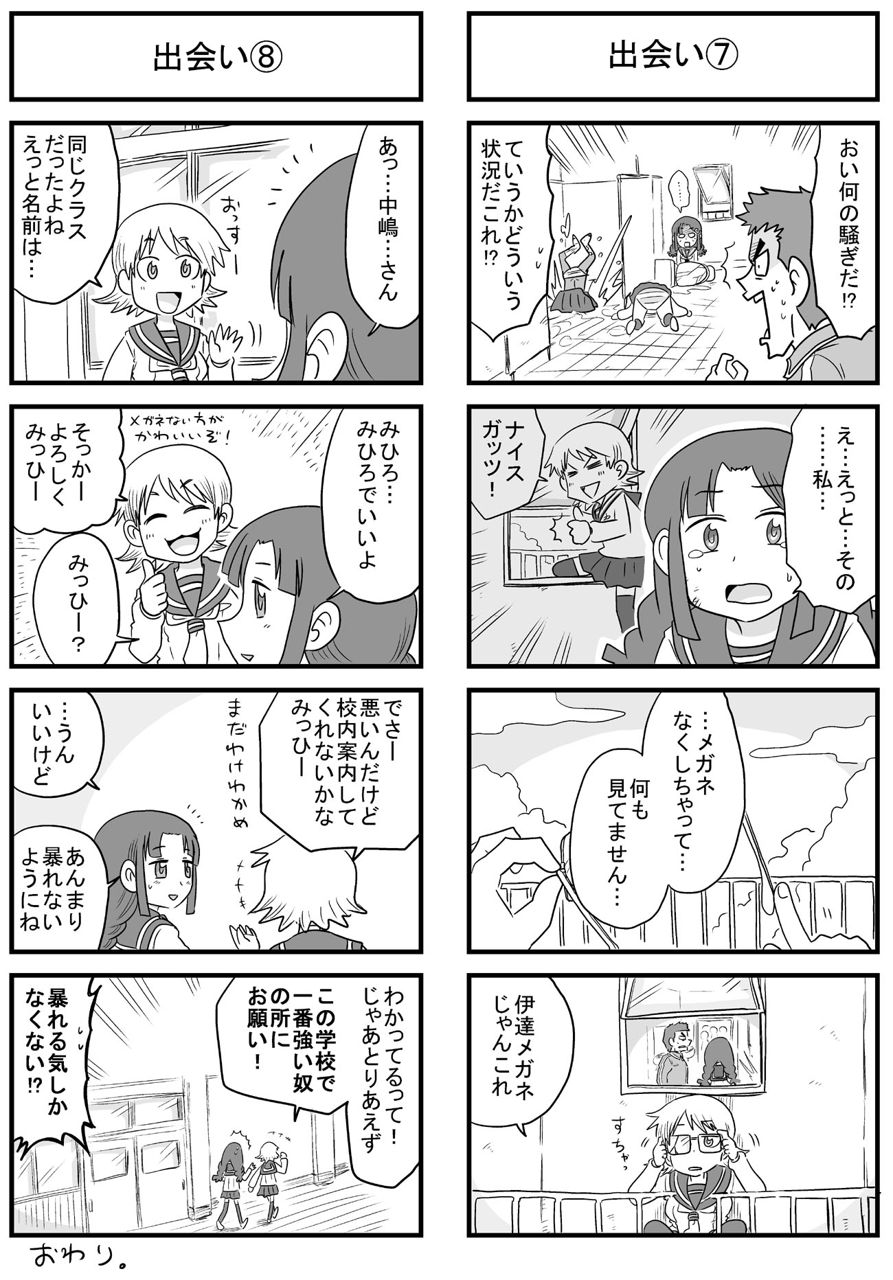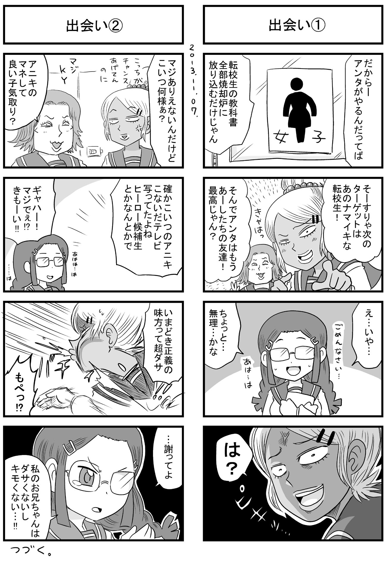 ニコニコ静画でも長い時間かけてようやくトータル1万再生を超えて、もっと多くの人に触れてもらえたら嬉しいなぁと思いますよしかし。 他の人気作品の再生回数とかトータルも速度も桁違いですごいもん。 のんじゃん!まとめ(ニコニコ静画) なんやかんやあってこの趣味のシリーズの主軸にしている、キャラの薄い「中嶋」と「みっひー」というふたりがいますが、そのふたりの出会いの物語をもってしてプロローグとしたいと思います。 駆け足でなんとか8本に収まり、このあと番長であるウサギ山と戦ったり、さらに1年後に「その3・4」でナメック星に旅立つんでしょうね。 何言ってるんだワシは。 描いてから見直すと、ネームの粗とかすごい目に見えてくるんだけど、そういう反省は雑誌に投稿する漫画とかで活かしていきたい。 先日ブログでも書いた保険委員モノの方は、ちゃんと色々意識してネーム作りました。 単純に描いていて楽しいので、やっぱり4コマ漫画はいいなぁと思いました。 あとはこれを仕事にできたらどんなに嬉しいことか。 そのためにはちゃんと面白い4コマ描けるように頑張ろう。 |