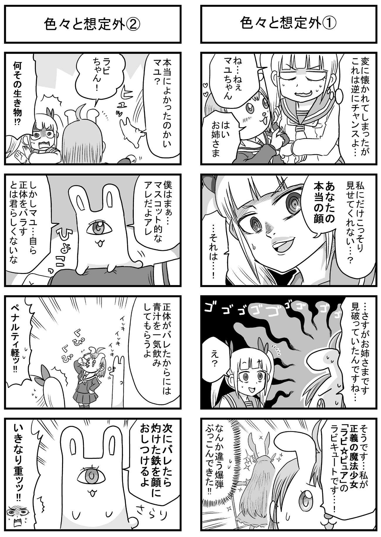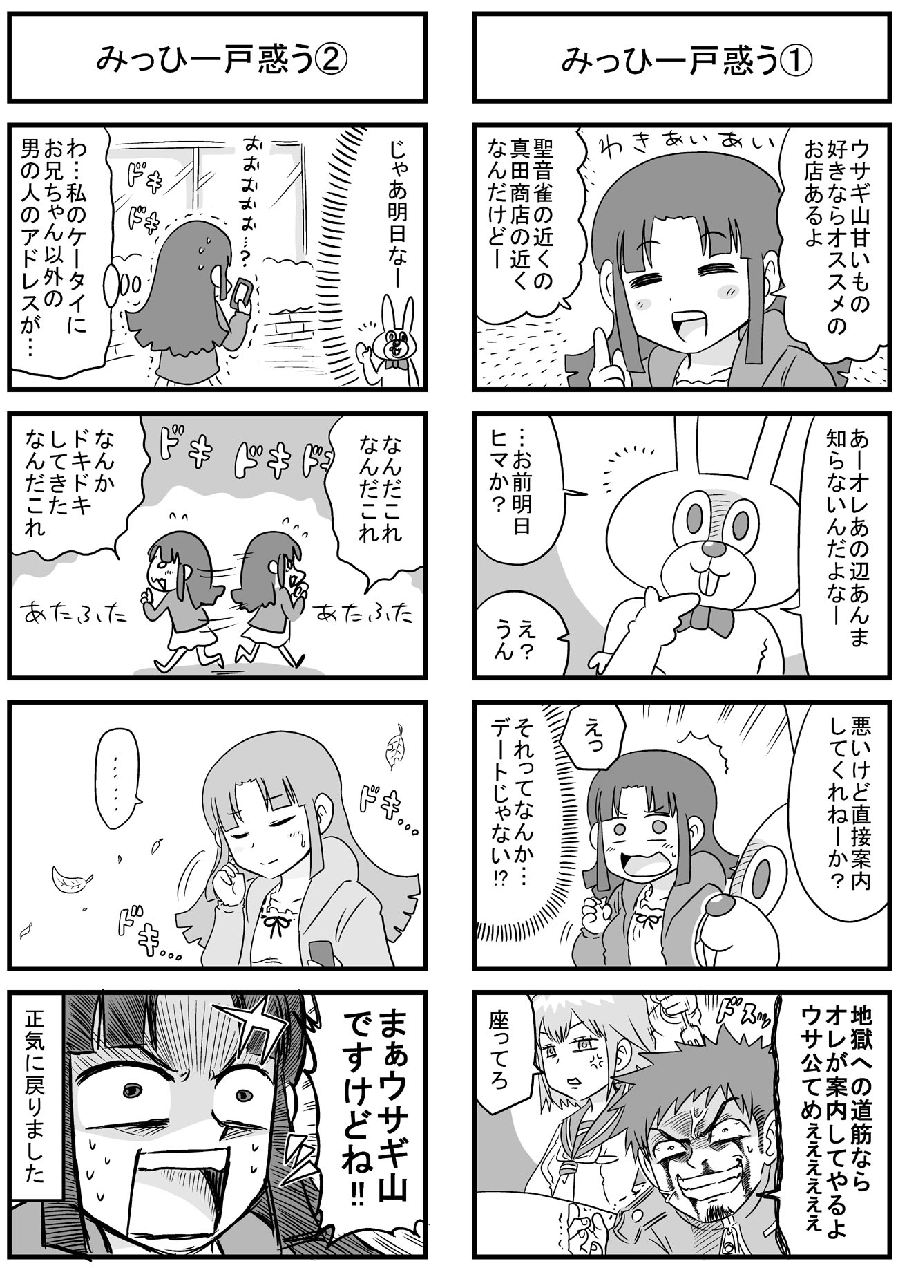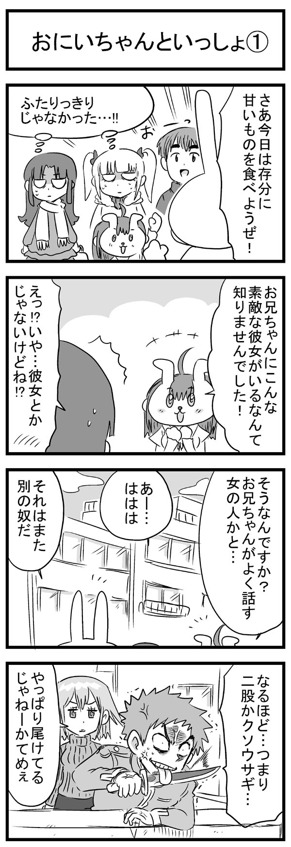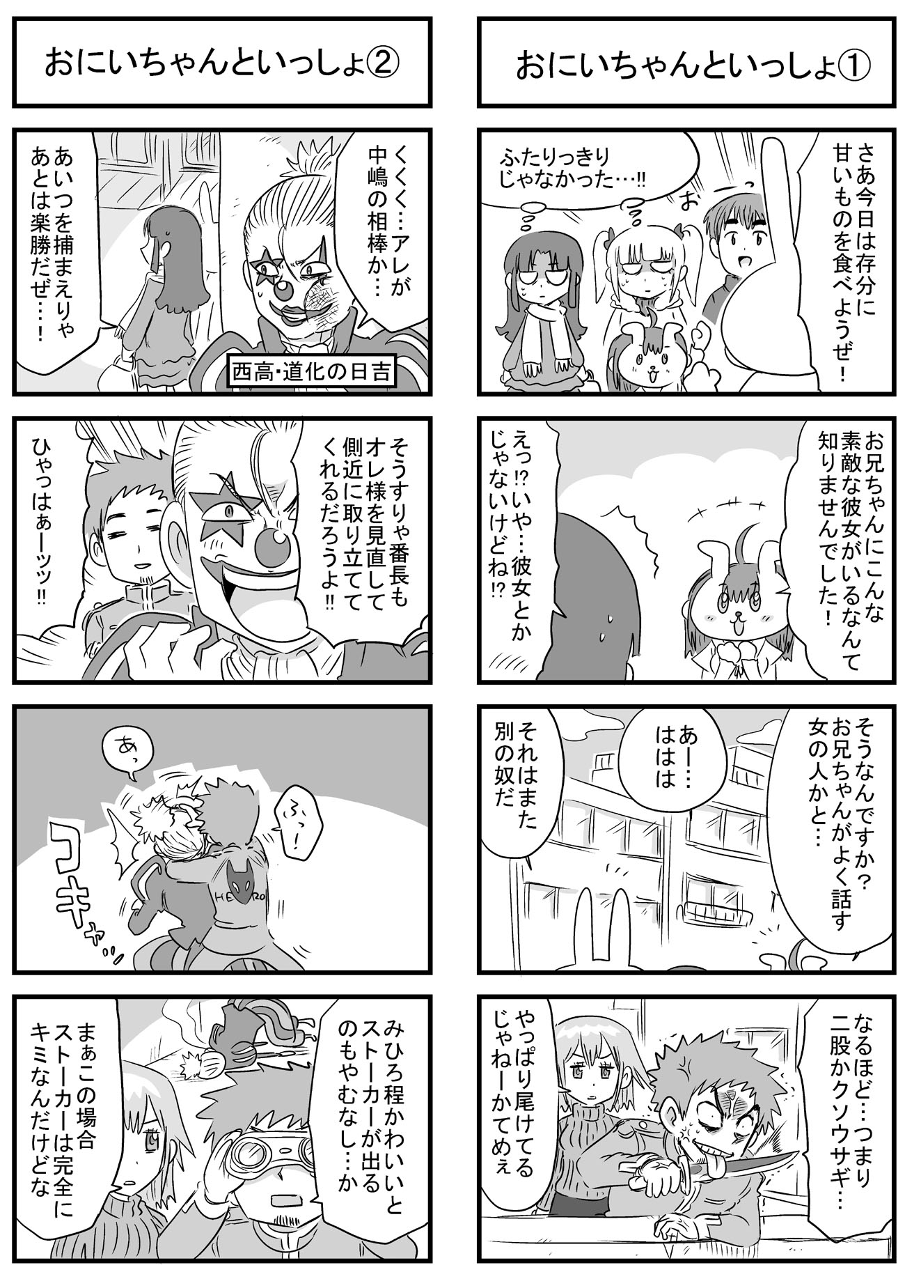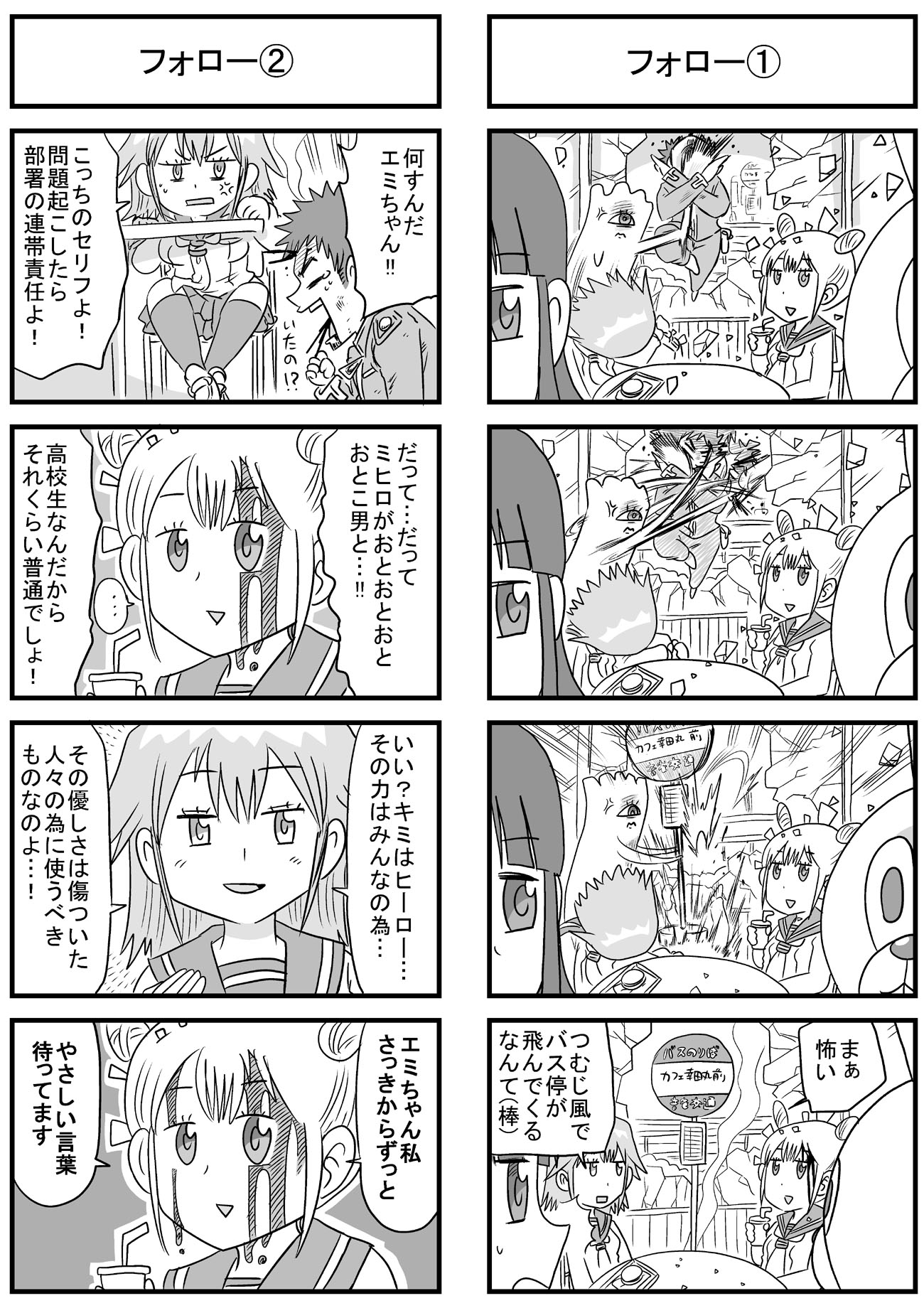 ニコニコ静画でも長い時間かけてようやくトータル1万再生を超えて、もっと多くの人に触れてもらえたら嬉しいなぁと思いますよしかし。 他の人気作品の再生回数とかトータルも速度も桁違いですごいもん。 のんじゃん!まとめ(ニコニコ静画) なんやかんやあってこの趣味のシリーズの主軸にしている、キャラの薄い「中嶋」と「みっひー」というふたりがいますが、そのふたりの出会いの物語をもってしてプロローグとしたいと思います。 駆け足でなんとか8本に収まり、このあと番長であるウサギ山と戦ったり、さらに1年後に「その3・4」でナメック星に旅立つんでしょうね。 何言ってるんだワシは。 描いてから見直すと、ネームの粗とかすごい目に見えてくるんだけど、そういう反省は雑誌に投稿する漫画とかで活かしていきたい。 先日ブログでも書いた保険委員モノの方は、ちゃんと色々意識してネーム作りました。 単純に描いていて楽しいので、やっぱり4コマ漫画はいいなぁと思いました。 あとはこれを仕事にできたらどんなに嬉しいことか。 そのためにはちゃんと面白い4コマ描けるように頑張ろう。 |