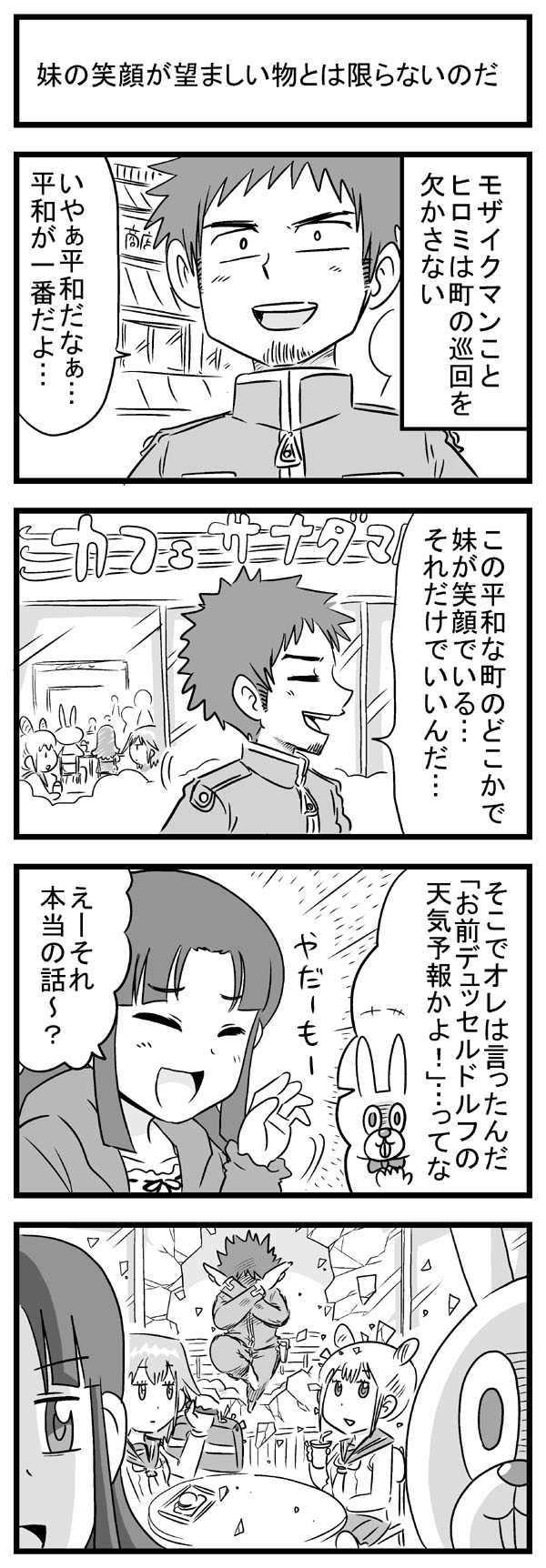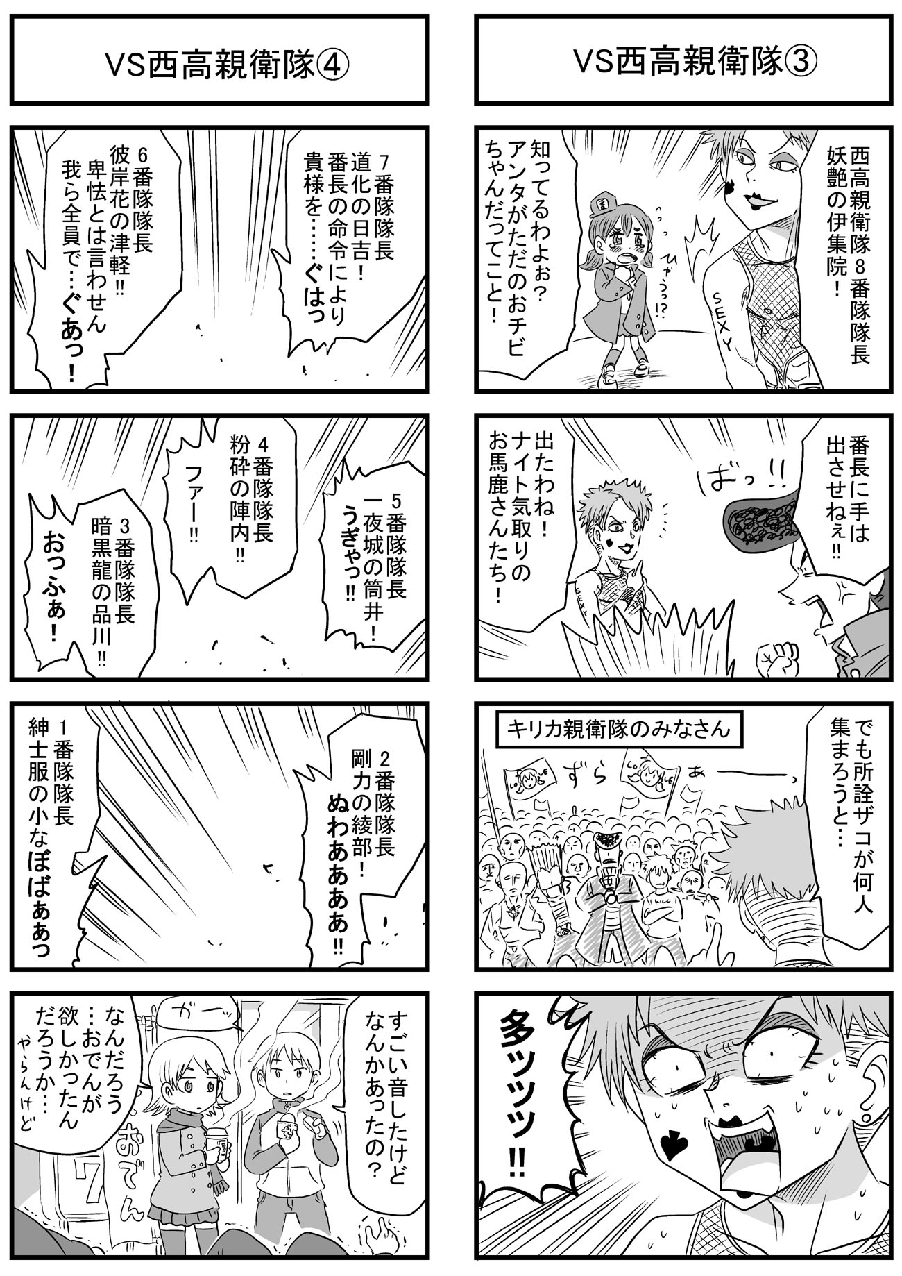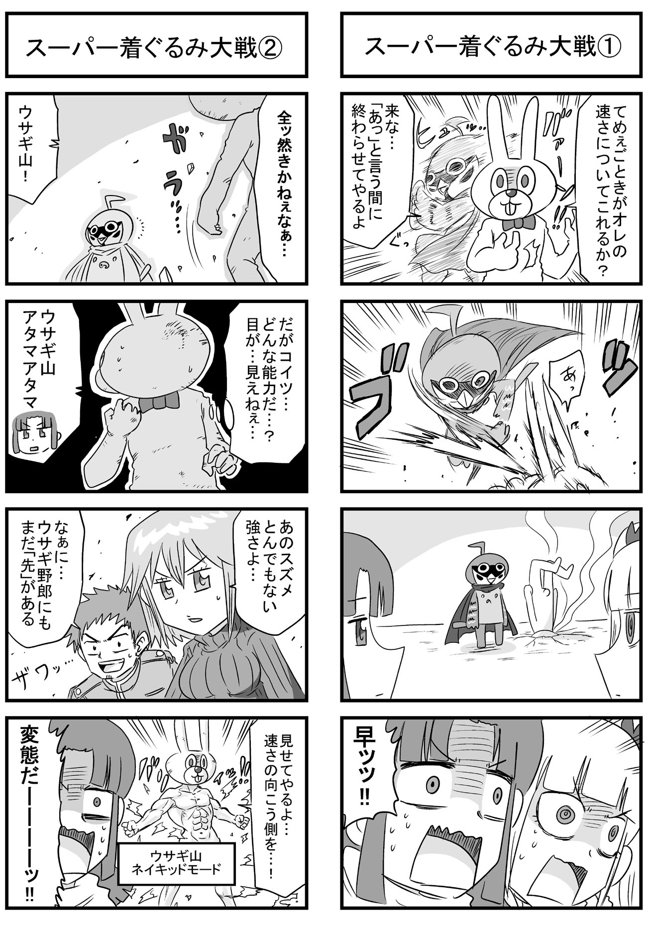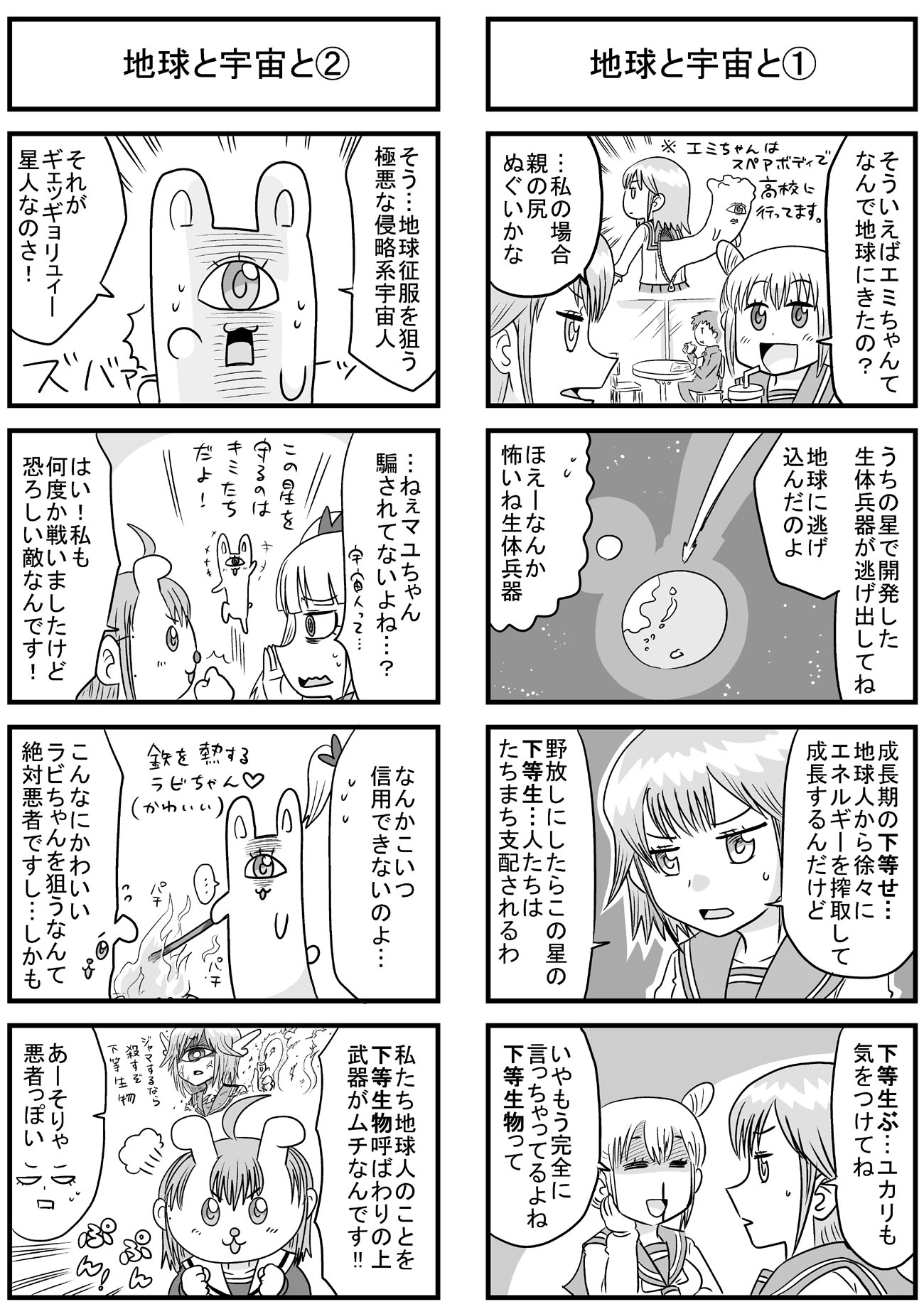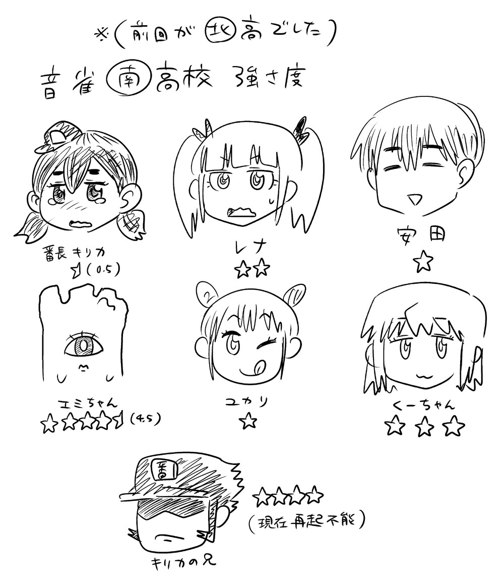 51~64話まとめ。 なんとなく淡い恋みたいなんをやろうと思ったらこのザマだよ。 3ヶ月ぶりに幽霊ズ描いたんで初期のと比較してみました。 親衛隊を10人に設定して失敗したと思ったけど割と取り返しついた。 伏線回収するの忘れてたんで、本筋と同時進行で回収し始めました。 いつ終わらせようと思ってた名探偵シリーズをやっと再開。 なんか少年誌みたいなことやってます。 こういうのやりたがるから受けないねんワシの漫画。 過去に出てきたキャラを、本来のスジに乗せなおすために40話ぶりの登場とかザラ。 【過去分のまとめはニコニコ静画で】http://seiga.nicovideo.jp/comic/7760?track=list ※5コマ目とかオマケのイラストとかも載せてます。 話数も60話、本数にしたら80本くらいになって、再生数もようやく2万を超えました。 たまーにもらえるコメントがささやかな楽しみです。 趣味の4コマで好き勝手やってますけど、投稿するための原稿はちゃんと構成とか色々考えてやってます! ていうか10月に送ったFAX、番号合ってるか不安だったけどおそらく届いてない。 前に送った分も含めて、今描いてるネームを直接郵送しようと思う。 あと、ツイッターで応援させて頂いていたオオトリキノトさんが、今月(2日発売)のまんがホームで読みきり掲載を果たしたりとめでたいです。 オオトリさんの活躍を祈るとともに、その勢いに便乗してさぁ追いつけ追い越せ的にワシも頑張りますとも。 「地球と宇宙と①②」でとうとう話数50を達成しました。 趣味の4コマとはいえ、飽きっぽい自分が長く続けられたのは嬉しい。 あと最近よくわからないけど2本立てで描いてます。 過去に登場したキャラはいつかまた出す、他のキャラと接点を作るという方向でやってますけど、毎回毎回思いつきでやってるので色々しっちゃかめっちゃかです。 キャラを出した段階では魔法少女ネタとか一切考えてなかったし、そこに宇宙人キャラを絡ませるとかもあとづけですから構成力もクソもないよ! あと4コマ漫画では全然関係ないだろうけど、強さランキングとか作ってると楽しいですよね。 ☆1 貧弱 ☆2 平凡 ☆3 常人の範囲で強い ☆4 超人的な戦闘力 ☆5 中嶋 現状、編集さんが絡む漫画のことは、返事がくるまで何も手をつけられない状態なので、趣味に全力をつぎ込むのもいいかもしれない。
